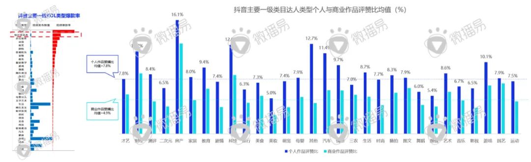 小红书从美的内容起家,美妆、时尚、个护等为传统优势内容,但报告同时发现影视、搞笑等娱乐化内容也迎来爆发式增长,搞笑类(个人作品完播率27.8%、商业作品完播率14%)、宠物类(个人作品完播率27.7%,商业作品完播率13.8%)表现都较为突出,另外,搞笑、娱乐、宠物、生活类达人的作品的赞藏比名列前茅。