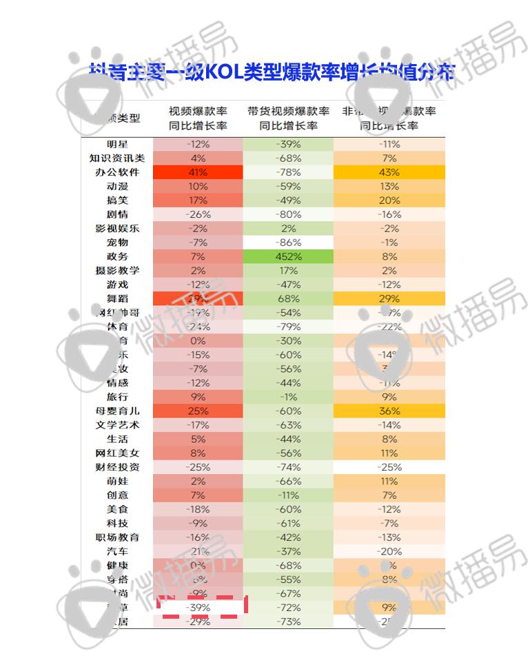 另一方面,达人数量的极速膨胀与内容供给的暴增,用户对于内容审美要求日益提高,最终导致内容流量的极度分散,不管是达人还是品牌也愈发感觉爆款来越难做。2023年初同比去年,几乎所有类型的抖音达人视频爆款率都出现暴跌,其中种草类达人爆款跌幅最大,跌幅近四成,此外,抖音挂车的带货视频爆款率更是“惨不忍睹”。