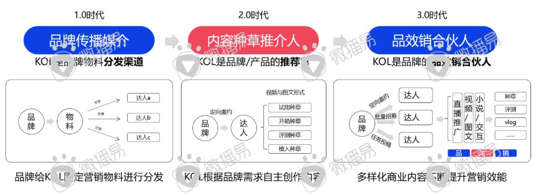 从品牌营销价值层面,在社交媒体营销演进中,平台和达人共同推动品牌的商业化进程。1.0品牌传播媒介时代,品牌仅仅把KOL当作“有粉丝价值的传播渠道”,合作模式局限于品牌给KOL固定的营销物料进行传播与分发;2.0内容种草推介时代,即KOL成为品牌或产品的推荐官,KOL的内容影响力与种草价值被越来越多品牌重视;3.0品效销合伙人时代,KOL不仅可以帮助品牌达成宣传推广的作用,还能有效提升用户对于产品的认知程度,其次更为重要的是,KOL电商+的玩法,让KOL兼具了“货架”功能。整体而言,目前,KOL以多样的商业内容、多样的商业合作模式提升品牌“品效销”营销效能。