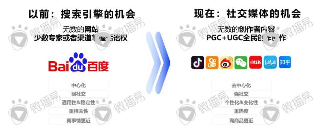以百度为首的传统搜索核心依托的是少数专家或主流渠道掌控者,是强烈中心化、离事情更近的搜索逻辑,搜索结果强调普世性、通用性和相关性,但伴随用户搜索需求越来越多元化、精细化、社交化,传统搜索也似乎越来不能满足用户的“渴求”,而以无数创作者为核心的社交搜索,天然离用户更近、离商品更近,搜索逻辑与结果更强调社交互动、个性化、重热度与时间更新。