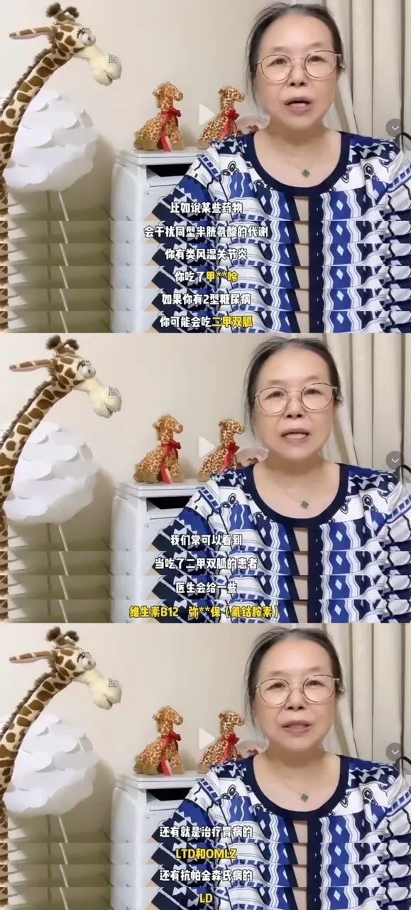 在这条关于同型半胱氨酸的科普视频中,讲到某些药物可能会干扰同型半胱氨酸的代谢时,孙宁玲举例:「我们经常可以看到,当(遇到)吃了二甲双胍的患者,医生会给一些维生素 B12——弥可保。」