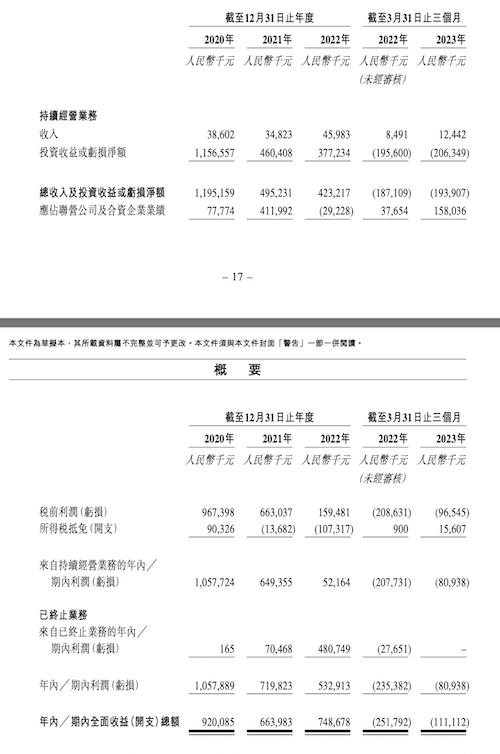 2023年第一季度,天图投资持续经营业务收入约为1244.2万元;总收入及投资录得1.94亿元亏损;持续经营业务录得8093.8万元亏损。
