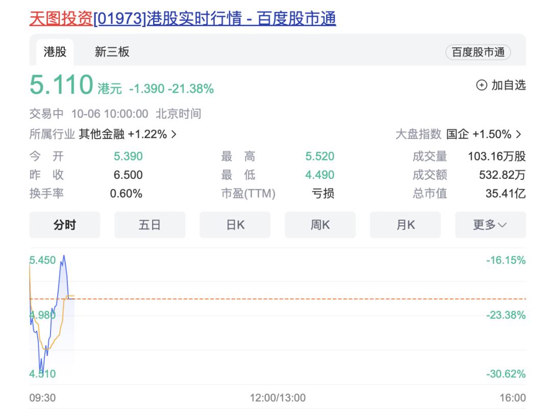 天图投资开盘跌17.08%,报5.39港元,市值37.35亿港元。随后跌幅进一步扩大,股价最低为4.49港元。