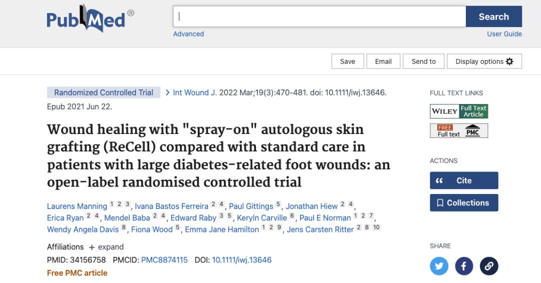 [9] Manning L, Ferreira IB, Gittings P, Hiew J, Ryan E, Baba M, Raby E, Carville K, Norman PE, Davis WA, Wood F, Hamilton EJ, Ritter JC. Wound healing with "spray-on" autologous skin grafting (ReCell) compared with standard care in patients with large diabetes-related foot wounds: an open-label randomised controlled trial. Int Wound J. 2022 Mar;19(3):470-481. doi: 10.1111/iwj.13646. Epub 2021 Jun 22. PMID: 34156758; PMCID: PMC8874115.