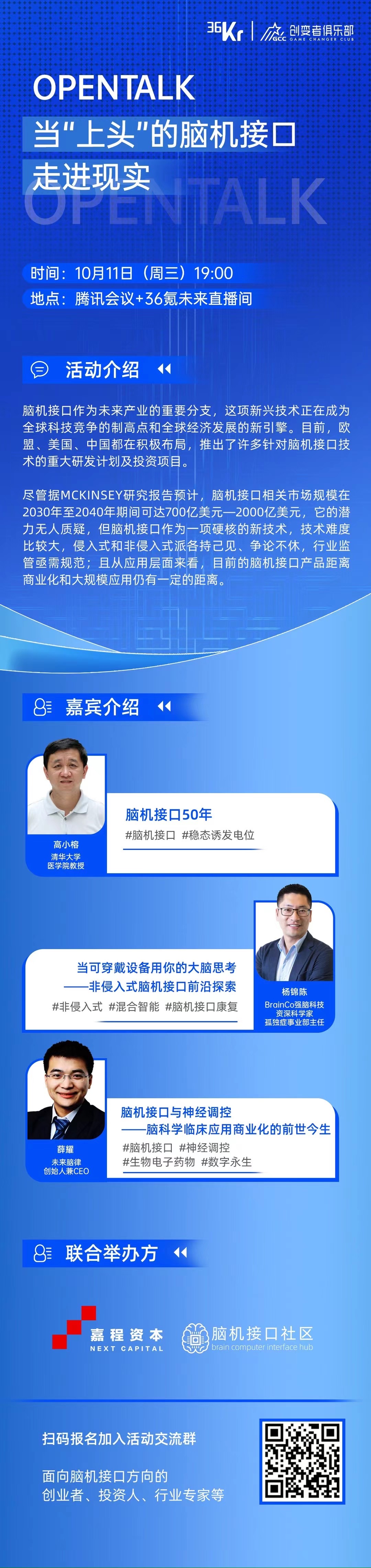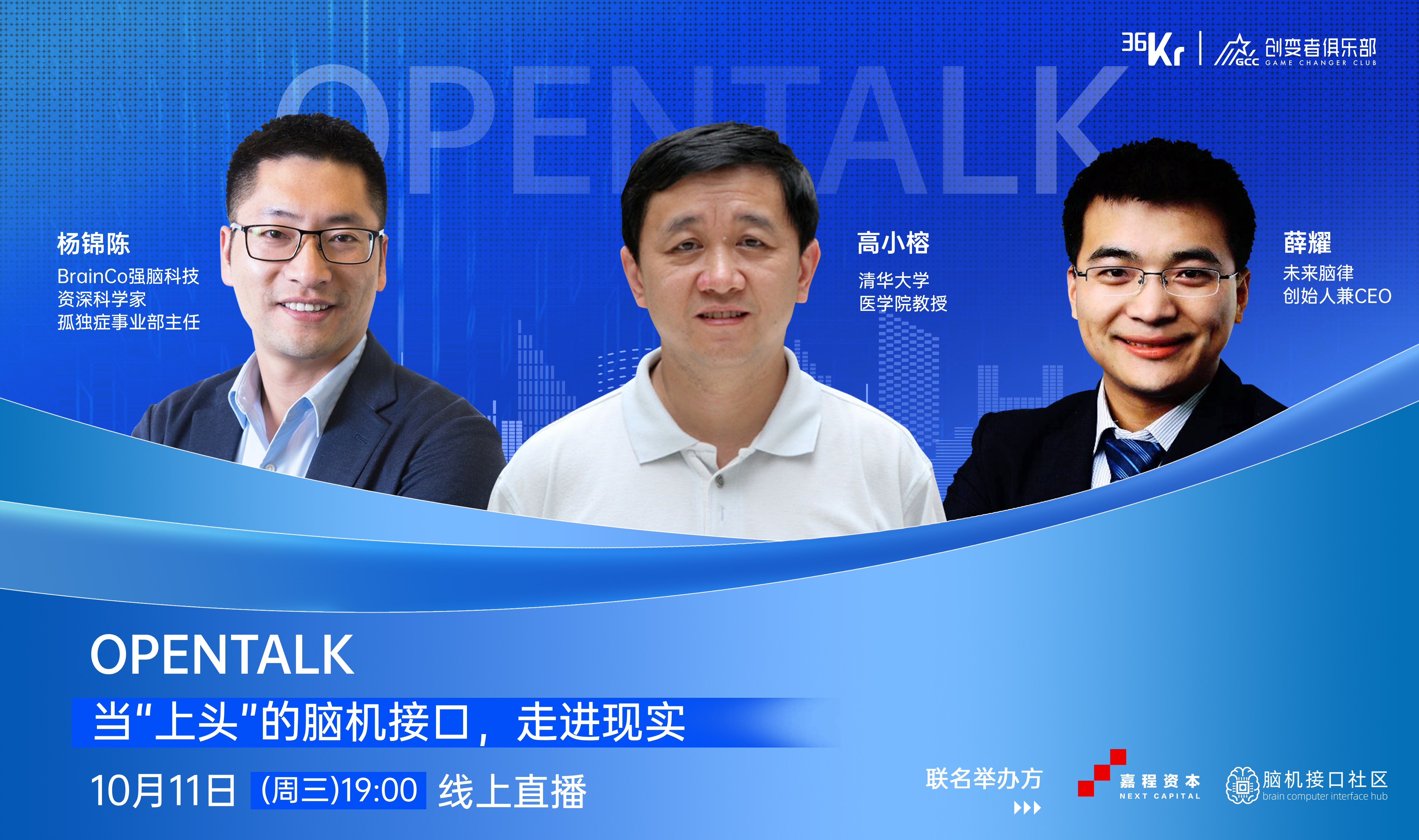 10月11日(周三)19:00 - 21:00,36氪·创变者俱乐部举办直播活动,直面「当“上头”的脑机接口,走进现实」。我们特邀清华大学医学院教授 高小榕教授、强脑科技资深科学家&孤独症事业部主任 杨锦陈博士、未来脑律创始人兼CEO 薛耀博士三位嘉宾进行线上直播分享&互动答疑。
