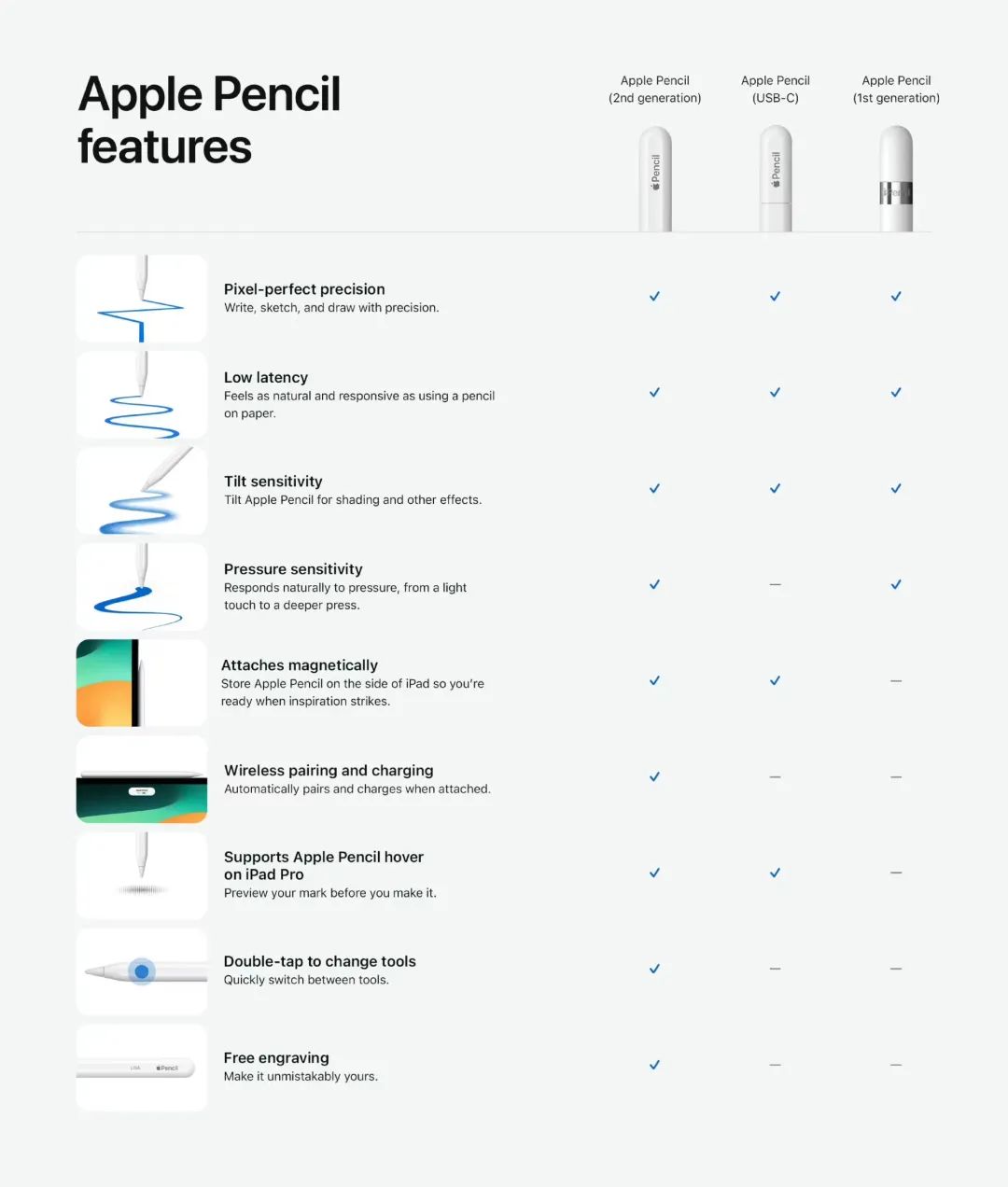 功能性方面,与此前的第一代及第二代产品相同,新款Apple Pencil同样具备像素级精准度、低延迟和倾斜角度感应等功能,是记笔记、绘图、添加注释、写日记等任务的理想工具。