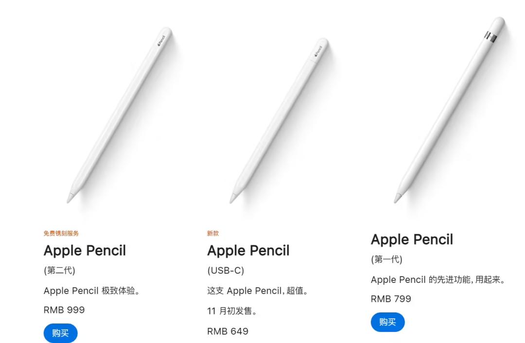 不过,苹果公司将该新款Apple Pencil命名为Apple Pencil(USB-C),并非传闻中的第三代版本。准确来讲,它处于一代笔和二代笔之间,暂且算它是1.5代。也就是说,加上新款,目前苹果一共提供了三款Apple Pencil的购买选项。