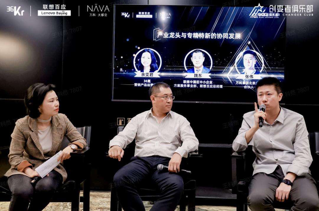 在活动的最后一个环节,联想中国区中小企业方案服务事业部&联想百应总经理 魏东、万科北京公司合伙人 张伟、36氪营销产品运营总监 余雯君就《产业龙头与专精特新的协同发展》主题展开了深度讨论。