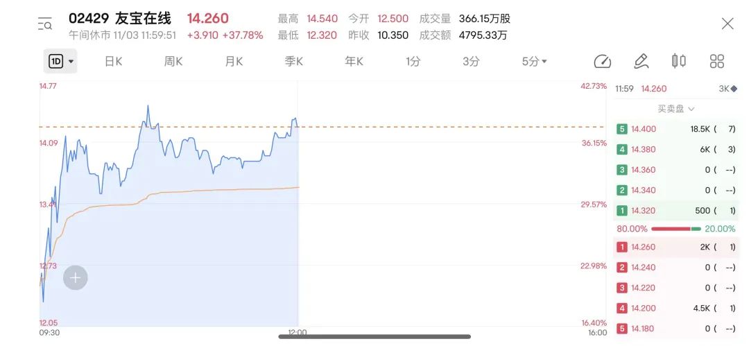 今日,友宝在线正式登陆港交所,发行价10.35港元/股,开盘报12.5港元/股。截至上午收盘时间,涨37.78%,报14.26港元/股,市值达111.20亿港元。