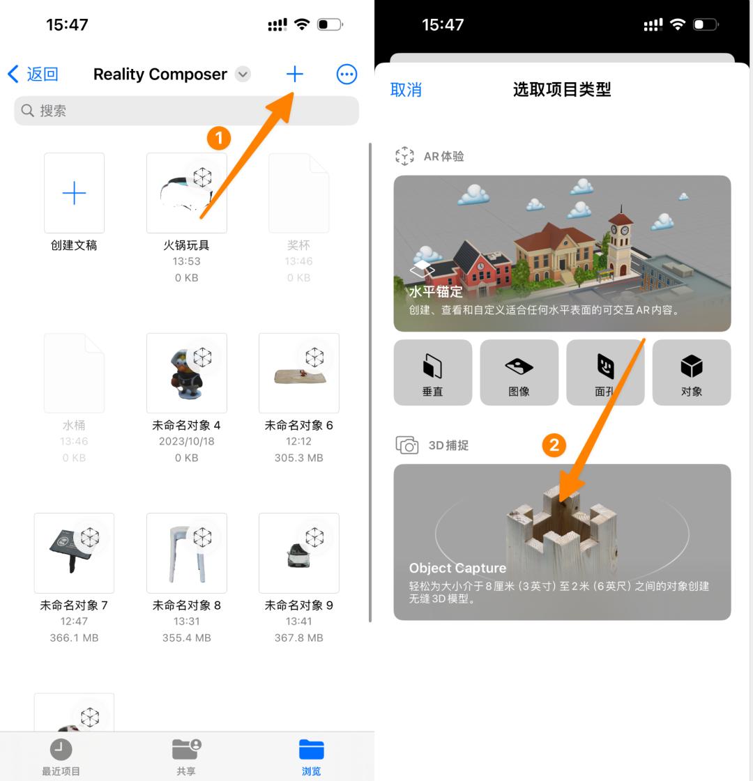进入 App 后点击右上角的 + 号,接着点下方的 3D 捕捉「 Object Capture 」,开始捕捉物体。