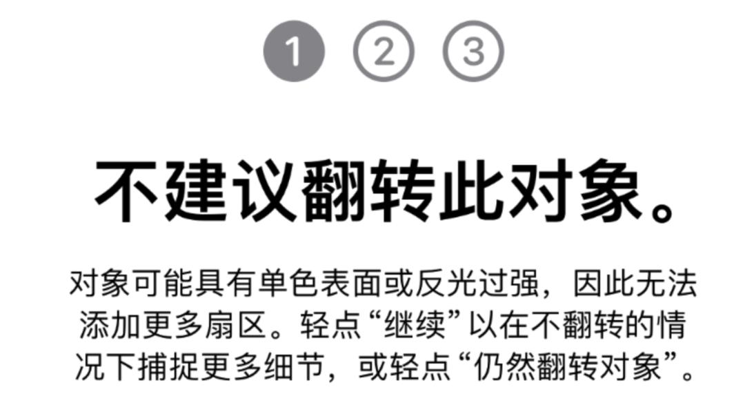 接下来你会经历三轮拍摄,每一轮拍摄都需要围着这个物体 360 度转一圈。三轮拍摄捕捉的扇区会最后就合并出一个完整的模型。