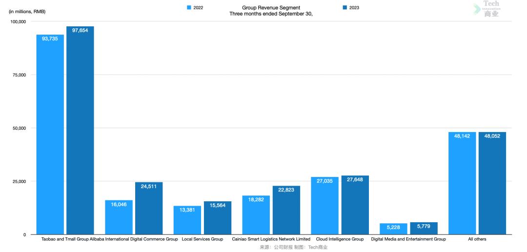 可以看到最新财季,阿里公司七分部业务中,阿里国际营收增速最高,其次为菜鸟、本地生活、数字媒体及娱乐,四分部业务分别表现为两位数增长。核心淘宝天猫业务、以及云智能业务增幅低于两位数。