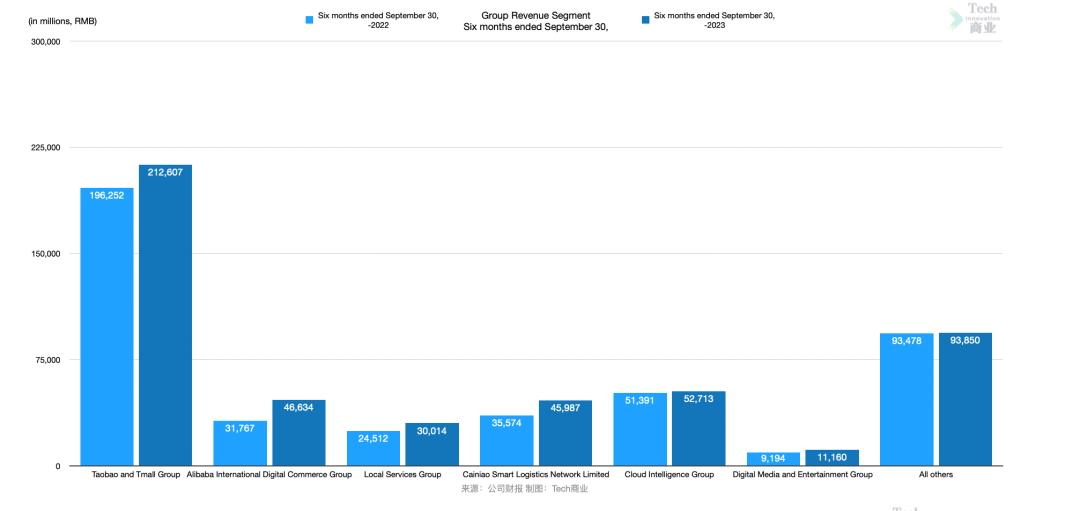 上半财年数据来看,阿里公司增幅最高同样为阿里国际。其次是菜鸟、本地服务、数字媒体及娱乐。该四项业务增幅为两位数。核心淘宝天猫业务、以及云智能业务增幅低于两位数。