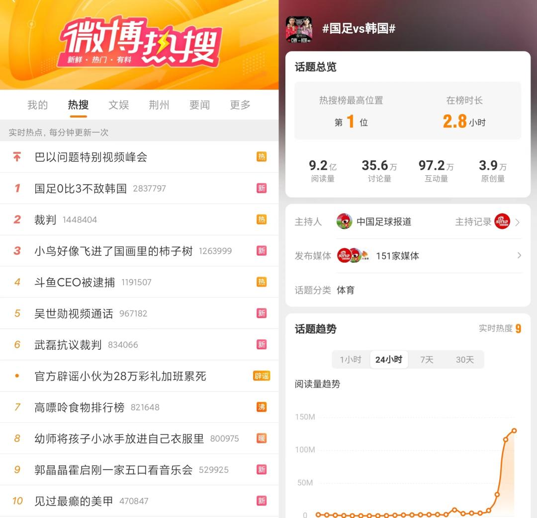 中韩大战是考验亦是盛宴,球迷积压的情绪在赛场内外释放,#国足vs韩国##裁判#等多个话题冲上热搜,#国足vs韩国#话题在赛后阅读量冲至9亿,显示出国足的顶流气质。