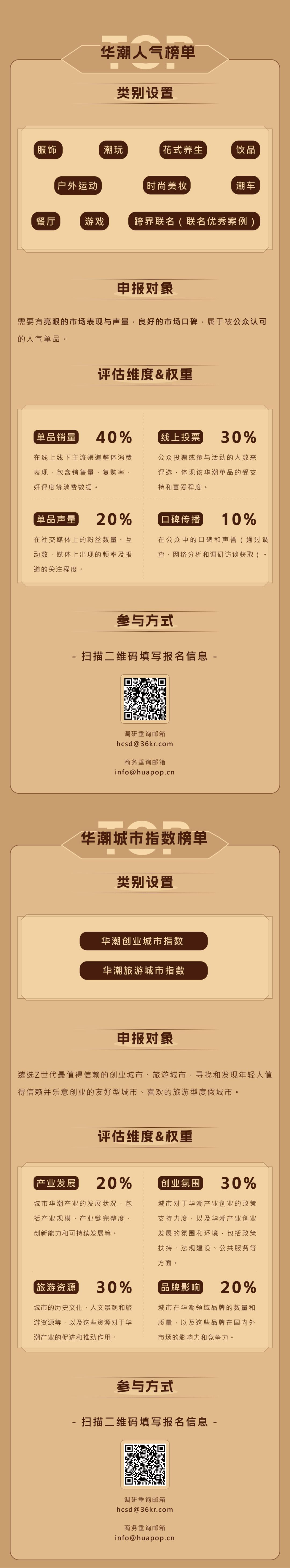 变的是维度,新增了 “华潮人气榜单”、“华潮城市指数榜单 ”、“华潮机构榜单”,旨在以更符合大众选择的具象类目产品,更能体现集体风貌的城市,及助力华潮推广的多元力量入手,让世界了解中国Z世代对时尚与风潮的趋势追求和对未来美感的认知趋势。