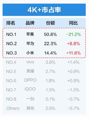 另一方面则是受到国产品牌的夹击。比如搭载麒麟芯片的Mate60系列,让华为拥有明显的差异化特征,11月华为在4000元以上的市场中占据22.3%的份额,仅次于苹果,同比增长8.8%,相比上半年15.6%的份额(IDC数据)也有明显回升,但尚未回到巅峰。