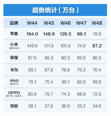 相比这三家国内品牌的快速增长,vivo和OPPO的表现有些不如人意。11月vivo手机在国内市场的激活量为383.3万台(含iQOO),同比下滑11.0%,市场份额为13.4%;OPPO手机的激活量为376.3万台(含一加、realme),同比下滑10.6%,市场份额为13.1%,排名第六。