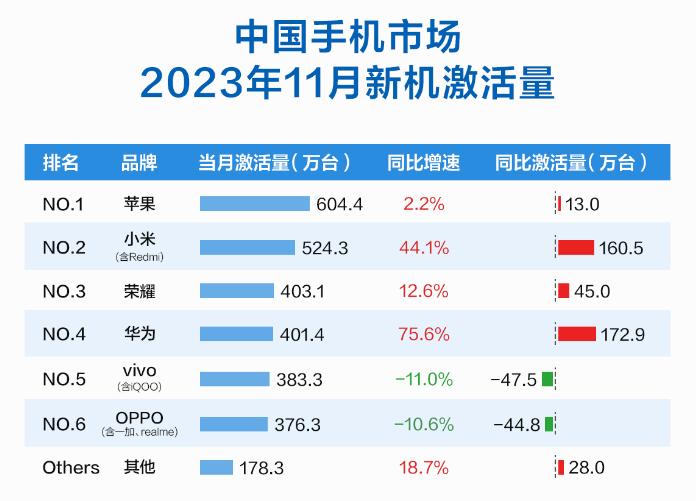 在各大厂商中,苹果iPhone当月的激活量为604.4万台,同比增长2.2%,并以21.1%的份额位居市场第一。相比苹果增速的“不温不火”,几大国产品牌可谓“几家欢喜几家愁”。