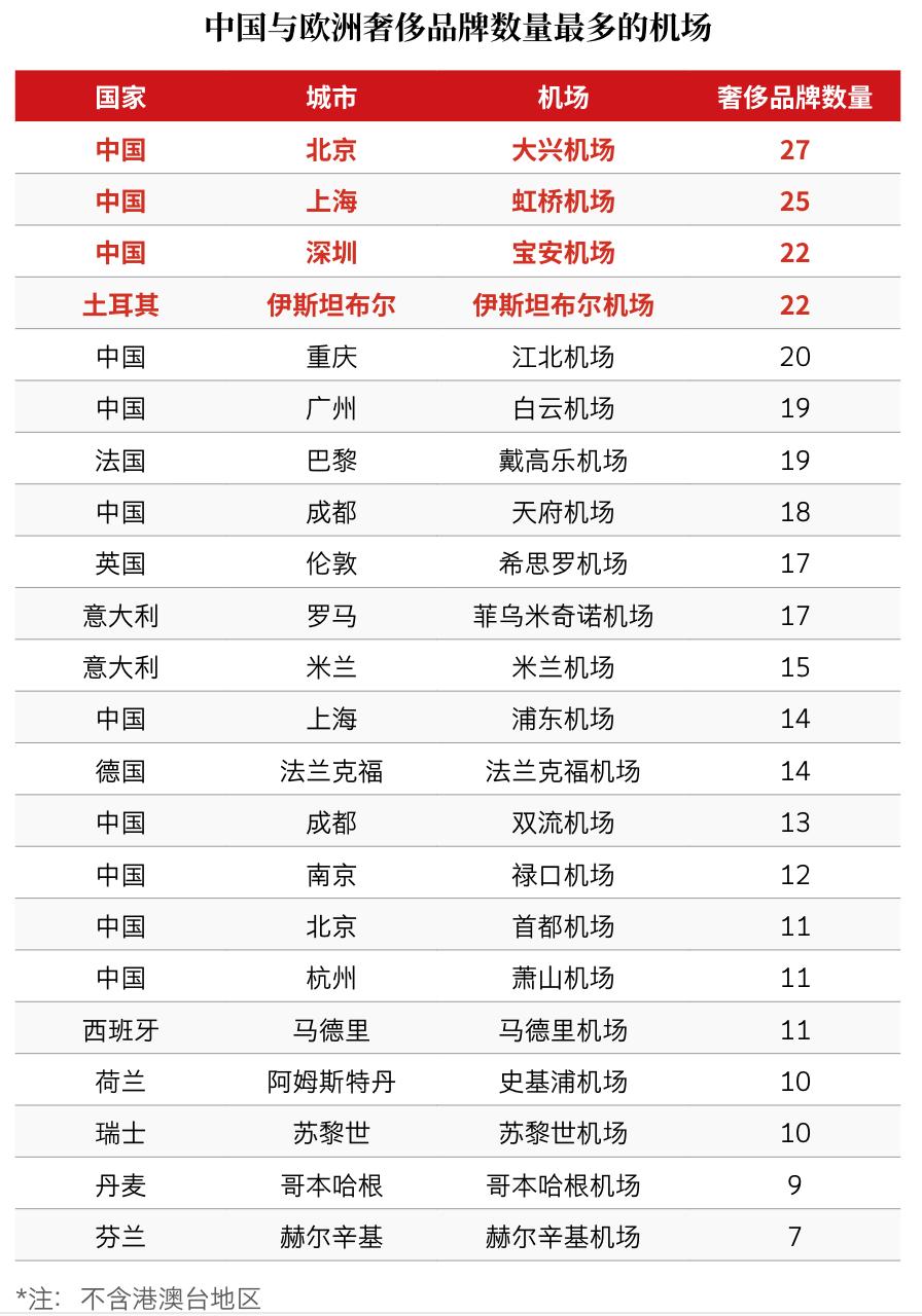 单从数量上来说,这在全球范围都属于顶尖水平。作为绝大多数主流奢侈品品牌发源地的欧洲,其不少大型机场的“含奢量”基本上与国内机场相当(甚至数量上还不及)。