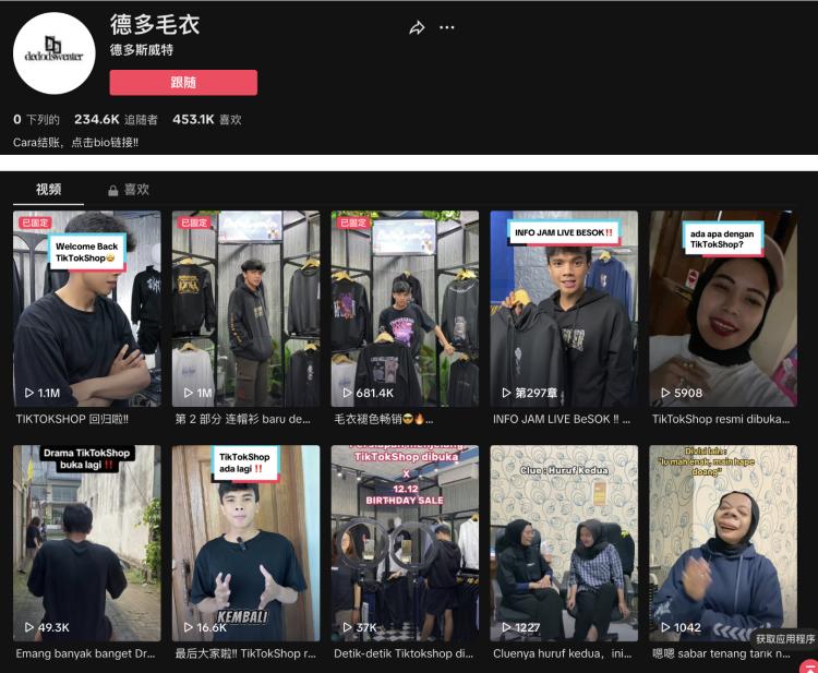 印尼本土服装品牌“Dedosweater”在 TikTok 拥有近23.5万粉丝,账号发布的关于 TikTok Shop 回归印尼的视频热度一条赛过一条。其中播放量最高的视频吸引了超百万的用户观看。