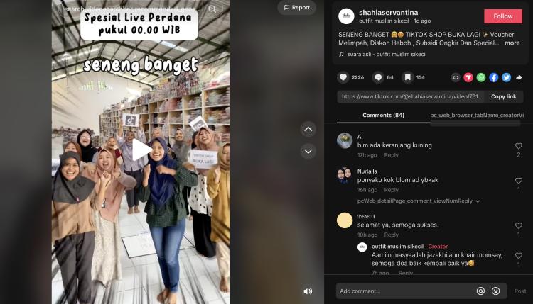 9月的新规中,相关部门抨击中国电商平台的低价服装损害了印尼当地商户的利益,并以丹阿邦服装批发市场的惨淡场景,为新规的合理性提供支撑。而今天点开 TikTok 看到的却是欣然分享 TikTok 回归前紧急备货重新填满库存的视频、集体高呼“TikTok Shop buka lagi!”(意为“TikTok Shop又上线了”)喜迎回归的本土商家。