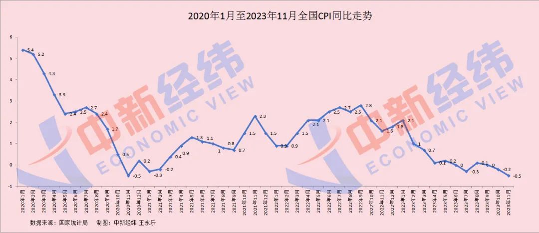 国家统计局数据显示,2023年11月,全国CPI环比下降0.5%,同比下降0.5%。CPI同比降幅超预期,且二次探底,创2020年12月以来最大降幅。