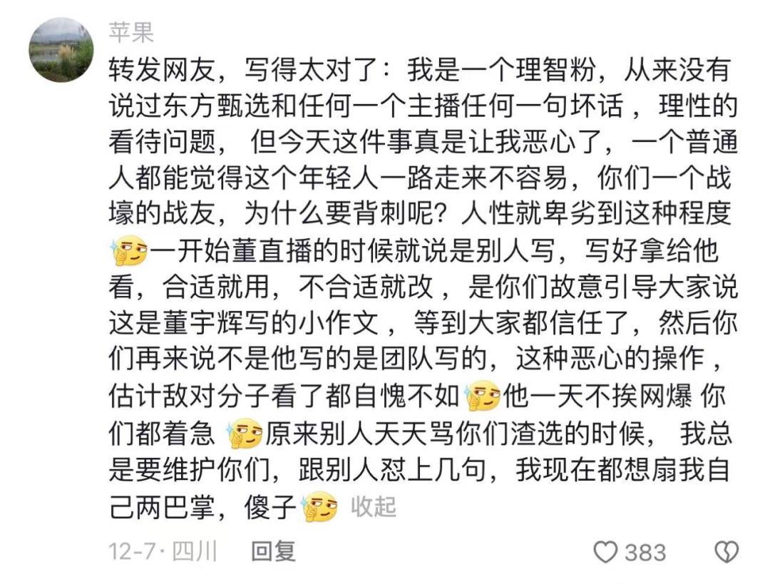 但从大叔目前的观察来看,至少在这轮事件中缺乏一锤定音的“素材”,反而是小编回怼董宇辉,才真正激怒了粉丝情绪,更是把东方甄选的内部问题撕开了一角。