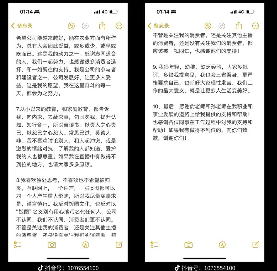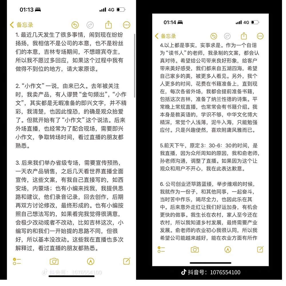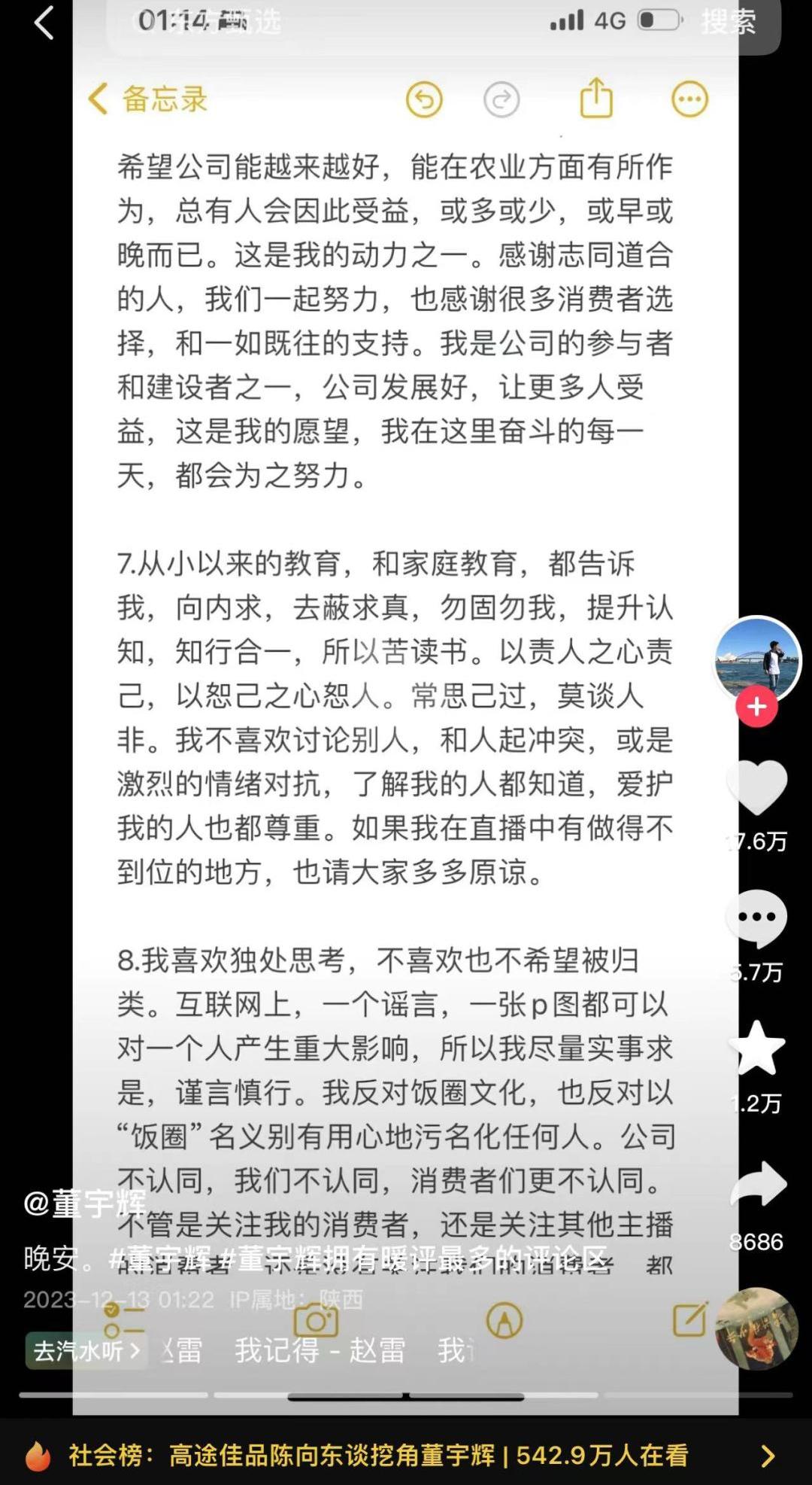 但舆情还是要灭啊,你的粉丝,你来安慰吧,才有了董宇辉的第二份在手机备忘录里,一个个打出来的声明。