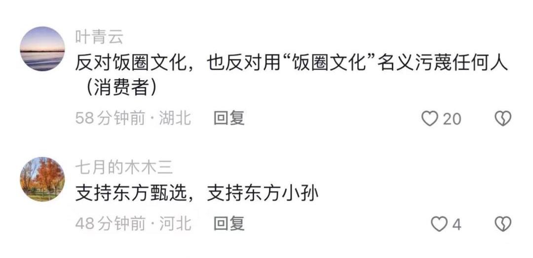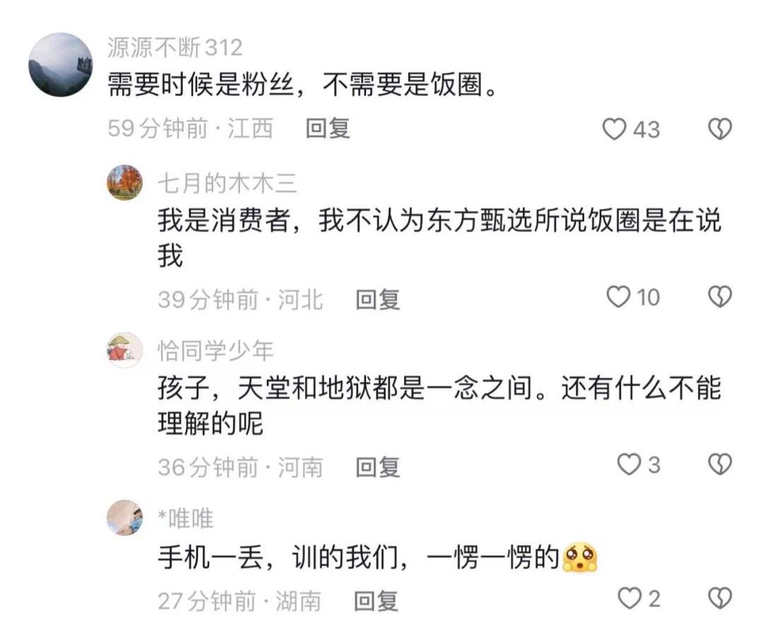 对于东方甄选异口同声的“饭圈”,粉丝们在留言区已经互相干翻天了,还挺对立的: