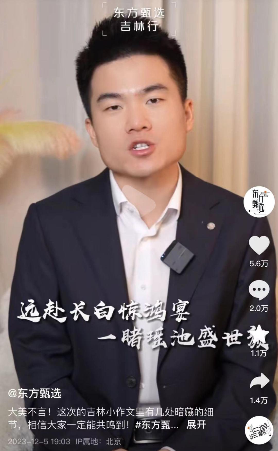 12月5日,东方甄选开启“吉林之行”的预热。按照之前的“套路”,董宇辉对着镜头,念了一大段“小作文”。截至目前,这篇短视频点赞5.6万,评论2万,收藏1.1万,都属于非常高的数据。