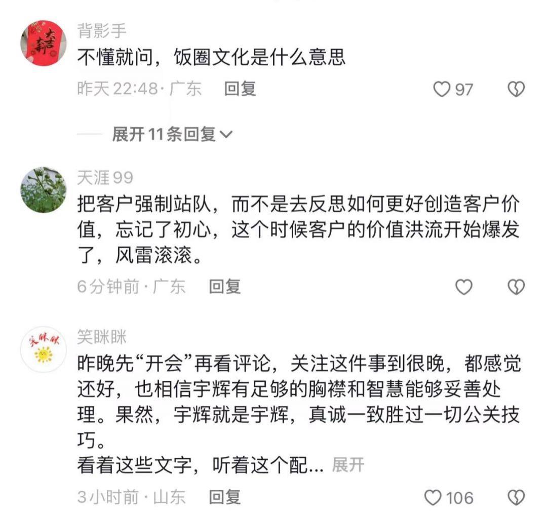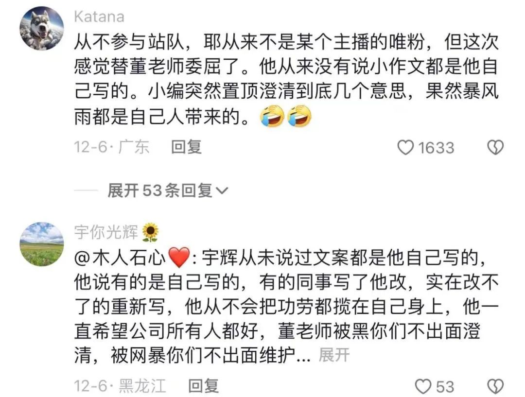 显然,平台是现实的强者,反过来,就成了舆情的弱者,但我们也看到了,东方甄选希望给粉丝扣上“饭圈”这样的标签,让公众认为这群“疯狂”的“董宇辉粉丝”才是强势的,是无理取闹的。