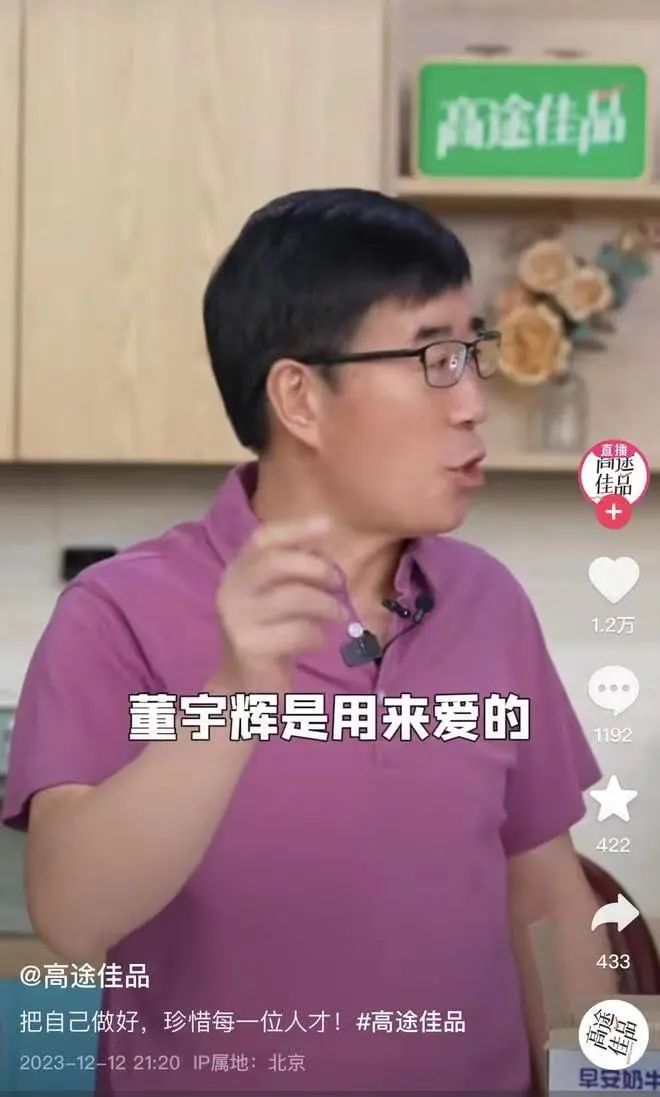 而高途创始人陈向东直接火上浇油,12月12日在直播间里,对于网友表示希望高途佳品将董宇辉挖过来,陈向东回应到:“董宇辉不是用来挖的,董宇辉是用来爱的。”