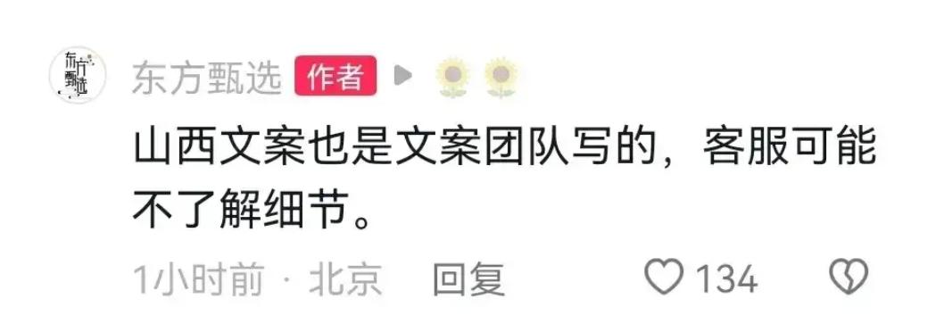 来自“字母榜”的截图和信息显示,东方甄选的小编继续回应说:“山西文案也是文案团队写的”!还称“俞老师天天在外飘,确实不知道业务细节。”