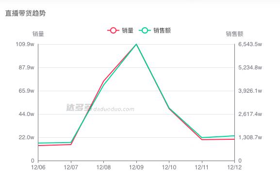 来自达多多的数据显示,从12月9日开始,东方甄选连续3天的直播销售额,从最高5000万-7500万销售额降到了1000万-2500万,仅剩高峰期的1/5。