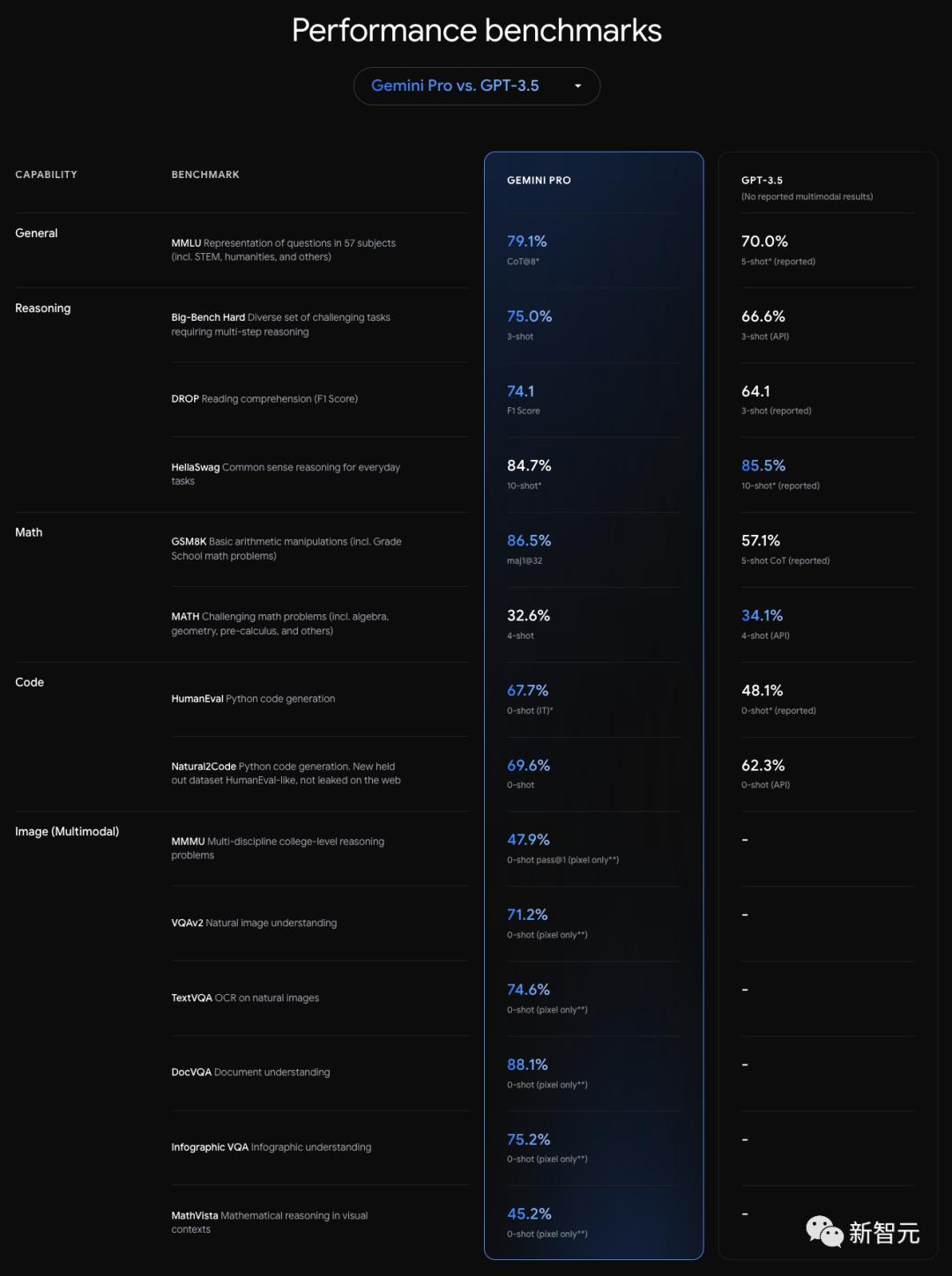 能力方面,根据谷歌的评测,Gemini Pro不仅在大部分文字基准中优于GPT-3.5,而且由于原生支持多模态,因此在图像评测上直接实现了降维打击。