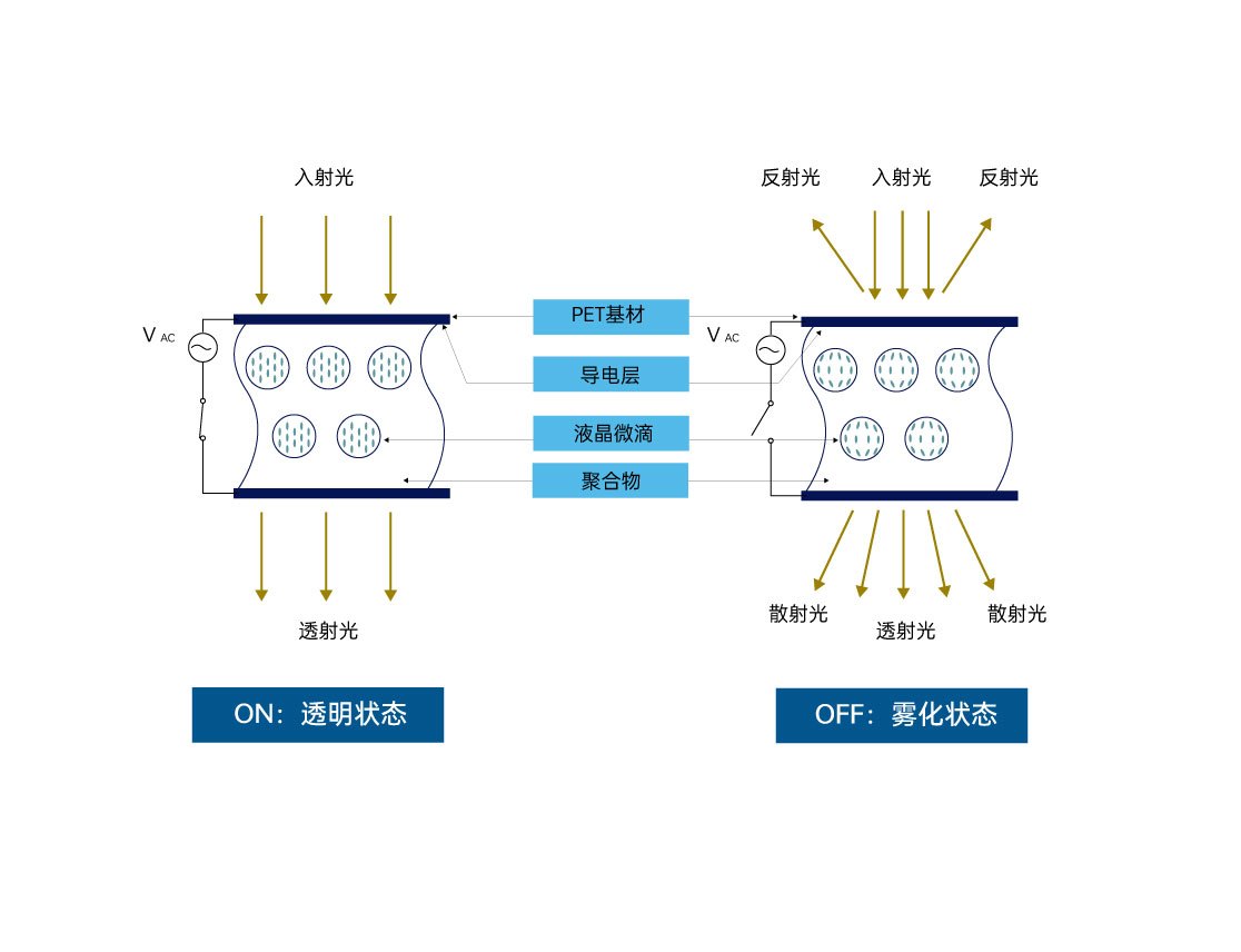 36碳了解到,调光膜材料主要包括PDLC(聚合物分散液晶)、EC(电致变色)、SPD(悬浮粒子装置)等不同的技术方案。其中,PDLC是柔性材料,原理是液晶膜中的高分子在通电时会有序排列,玻璃相应变成透明状,不通电时玻璃则呈现透光而不透明的外观状态。