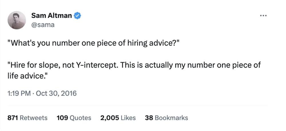 阿尔特曼在这条推文中这样写道:“你的首要招聘建议是什么?——招聘时要看斜率,而不是Y截距。这其实也是我的人生首要建议。”