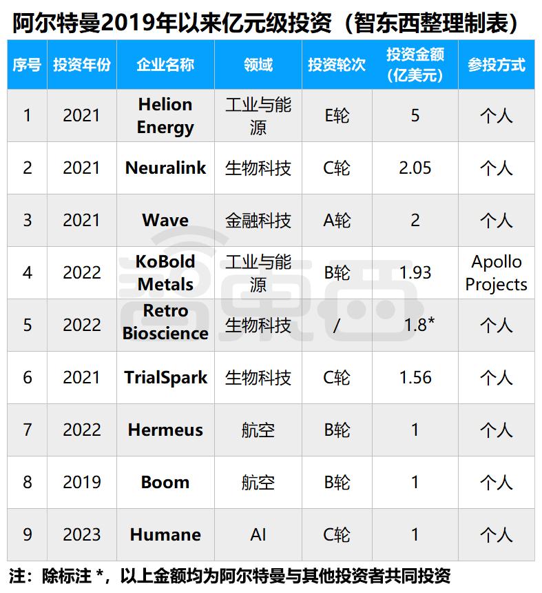 ▲阿尔特曼2019年以后参与的亿级投资(智东西制表,数据来源:CB Insight、CrunchBase)