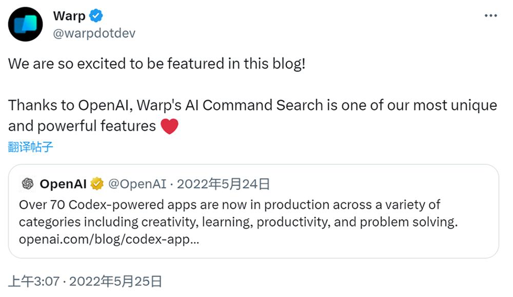 ▲Warp称其AI命令搜索由OpenAI Codex提供支持(图源:X)