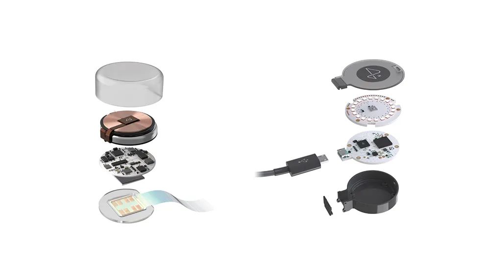 ▲N1 Link(左)及其可拆卸充电器/发射器(右)(图源:Neuralink)