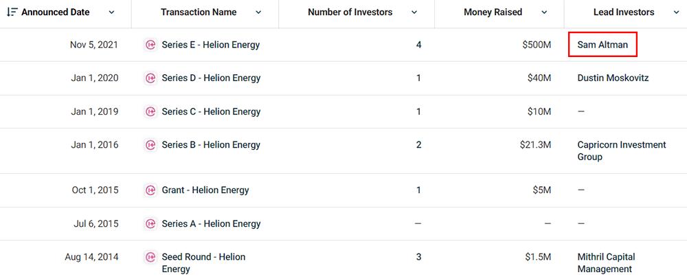 ▲阿尔特曼领投Helion的E轮融资(图源:CrunchBase)