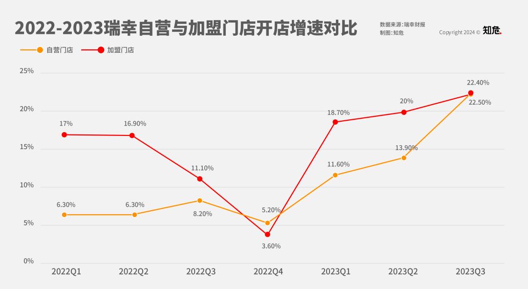 单看 2023 年三季度的表现,瑞幸所有门店总营收 72 亿元,其中瑞幸自营门店的收入为 51.41 亿元,较去年同期增长了 79.3%。而加盟门店该季度收入为 18.408 亿元,同比增长 104.7% 。