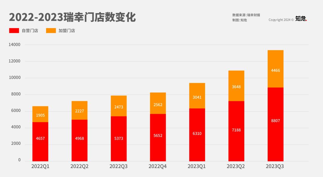 去年 11 月,瑞幸公布 2023 年第三季度财报,其中提到,截至第三季度末,瑞幸共有 13273 家门店,包括 8807 家自营门店和 4466 家合伙人门店( 即加盟门店 )。( 注:总门店数中包含 11 家新加坡门店 )