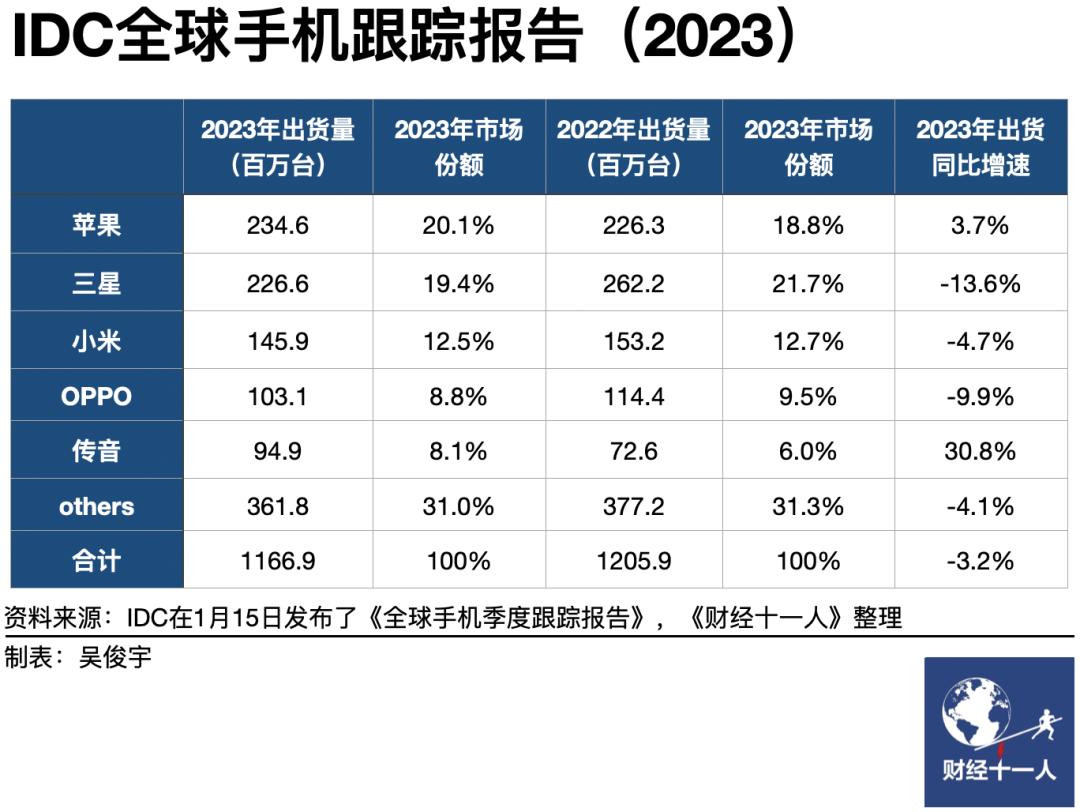 而且,最近,苹果时隔十年,重新回到全球手机出货量第一的位置。国际市场调研机构2024年1月数据显示,苹果手机2023年全球出货量高达234.6百万台,出货量全球市场份额为20.1%。