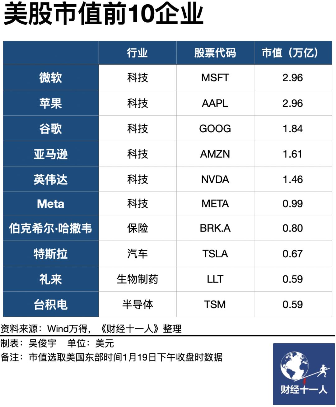 截至美国东部时间1月19日收盘时,微软、苹果市值均为2.96万亿美元,两家公司站在峰顶,把其他公司远远甩在身后。微软、苹果市值之和为5.92万亿美元 (约合42万亿元,按最新汇率换算) ,接近中国A股总市值 (44万亿元) 。