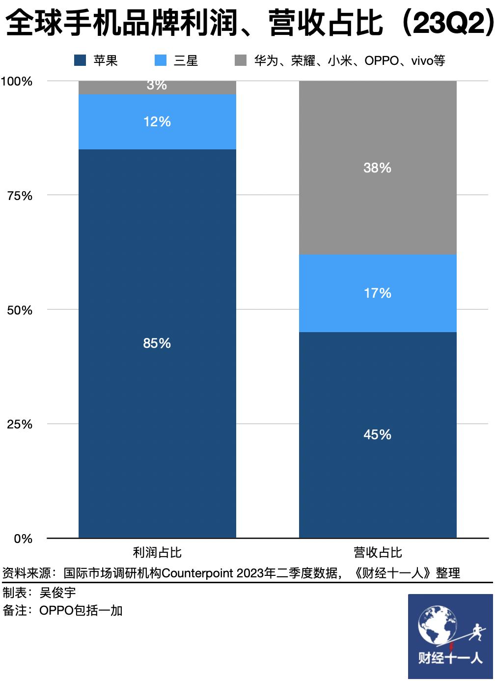 苹果的营收、利润在手机市场依旧具备绝对的统治力。苹果长期在手机市场占据超过40%的收据,独占80%以上的利润。国际市场调研机构Counterpoint在2023年8月的数据显示, 2023年二季度苹果占据了全球手机市场45%的营收、85%的利润,三星占据全球手机市场17%的营收、12%的利润,其他手机厂商 (华为、荣耀、小米、OPPO、vivo) 占据38%的营收,只占据全球手机市场3%的利润。