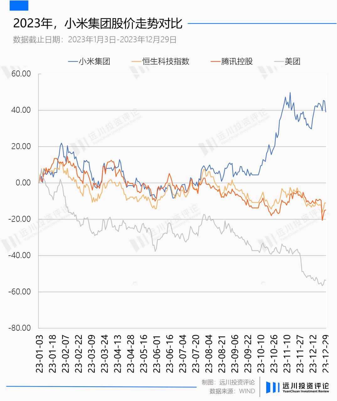 凭借着高端产品小米14系列的好评如潮,去年12月份小米手机国内销量成功超越苹果,成为中国智能手机市场第一。同时伴随公司在海外市场如中东、拉美等地区的势如破竹,2023年全年小米手机销量逆势增长,毛利润率也大幅提高,支撑着公司股价不断走强,2023年上涨42.60%。