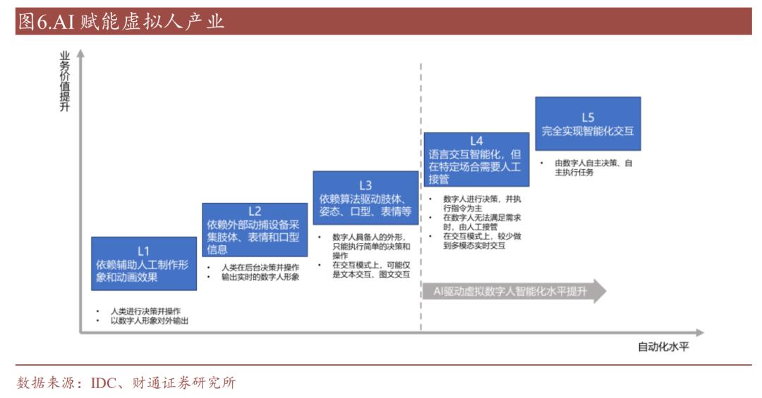 根据 IDC 咨询,根据虚拟人的自动化水平,可分为 L1-L5 阶段。如下图所示,目前我们正处于L3-L4的中间阶段,在直播间或者虚拟人互动的设备中,用户通过文字就能与虚拟人进行实时交流和对话,以用来介绍产品、替用户解决问题等等。