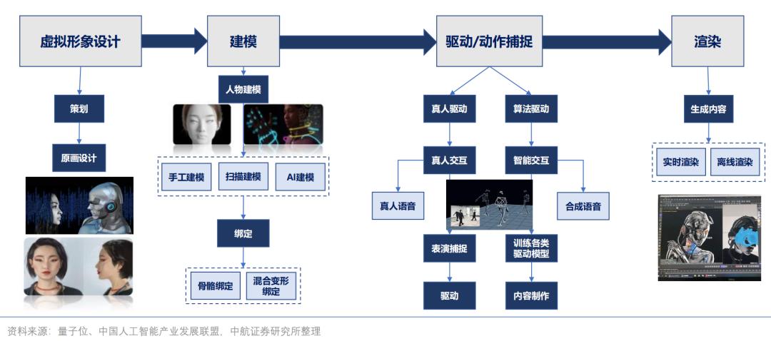 具体而言,2D虚拟人可使用图片处理器快速生成,3D虚拟人则需要建模、动画、渲染等环节;2D虚拟人需要的数据量较小,对算力要求不高,3D虚拟人则刚好相反;2D虚拟人对精细度要求不高,但3D虚拟人却要达到高仿真的拟人效果。