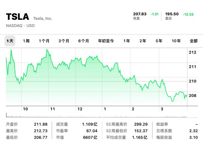 财报发布后,特斯拉美股跌超5%,每股报价不到200美元,市值6607亿美元。